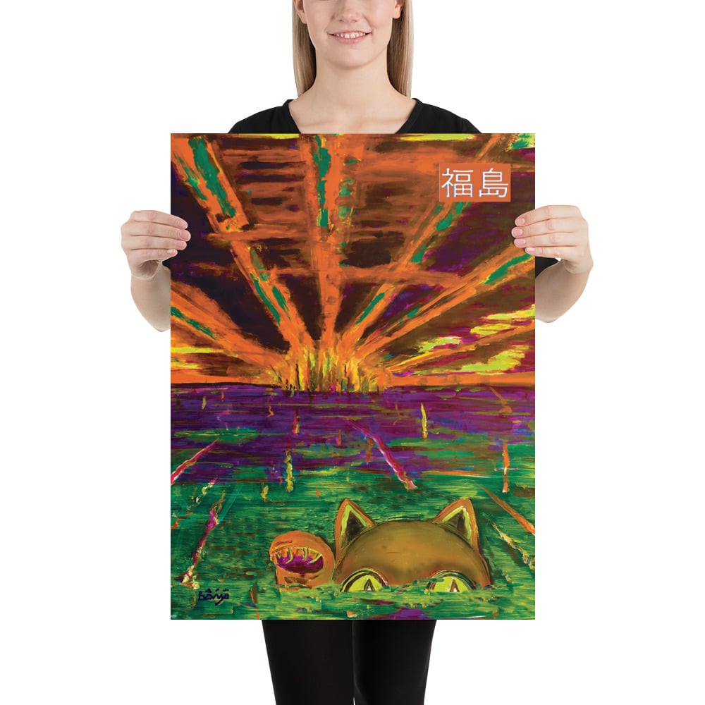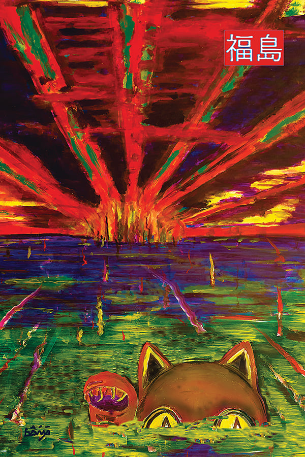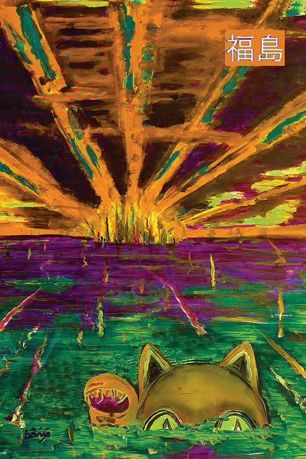 The Maneki Neko (begging cat) survives the Fukushima earthquake/tsunami/rx meltdown. 福島 is Japanese for Fukushima